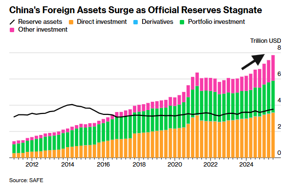 According to data from China’s currency regulator, private foreign asset holdings climbed to nearly $8 trillion, with more than $1 trillion added in just the first nine months of 2025. Official foreign exchange reserves, by contrast, remained largely unchanged during the same period, underscoring the private sector’s dominant role in this transformation.