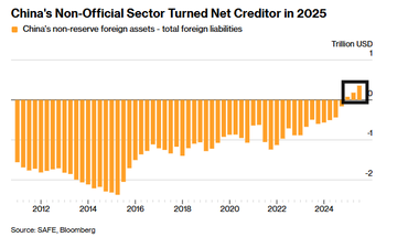 The surge in private overseas assets has fundamentally altered China’s external balance sheet. For the first time on record, non-reserve foreign assets minus total foreign liabilities turned positive in 2025, effectively making China a net creditor nation.