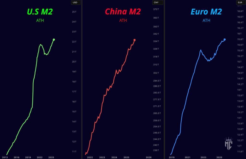- Global money supply has accelerated dramatically, with the U.S. Federal Reserve’s M2, China’s liquidity base, and the Eurozone’s money supply all reaching new all-time highs. The synchronized expansion shows U.S. M2 above $22 trillion, China’s M2 exceeding 334 trillion CNY, and the Eurozone approaching €16 trillion—a clear signal that major economies are flooding the system with liquidity despite inflation concerns.