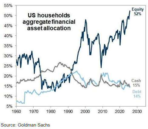 - Here’s something wild: U.S. households are now putting 52% of their total financial assets into equities. That’s higher than the Dot-Com peak, which is saying something. The data shows stocks at all-time highs while cash and debt sit around 15% and 14%. What this really means is that Americans are more exposed to the stock market than ever before—and that makes them incredibly sensitive to any policy shake-ups.