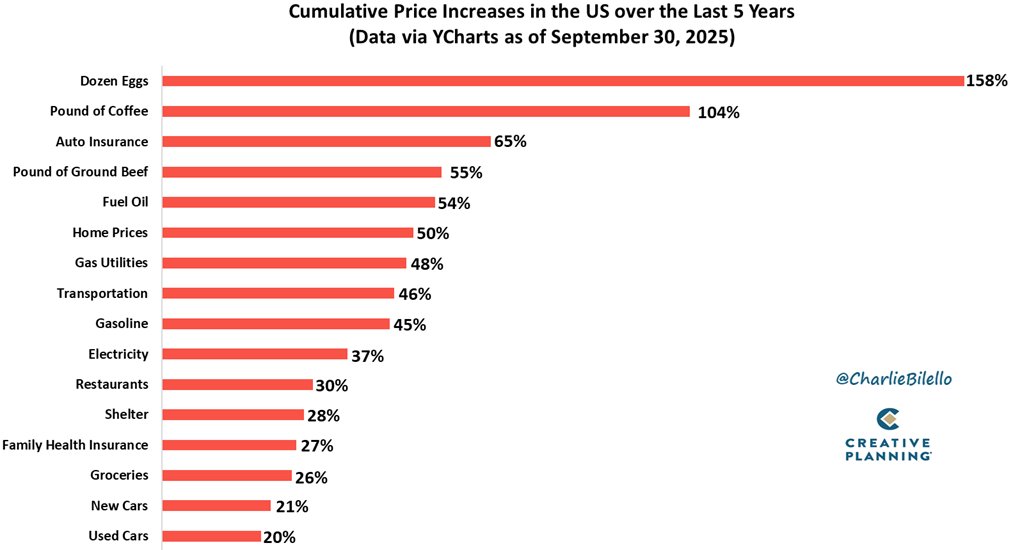 - The popular notion of “2% inflation” doesn’t match what American households actually face at checkout. A recent chart based on YCharts data through September 2025 shows essential goods prices have surged dramatically over five years—far beyond what officials call a stable inflation environment.