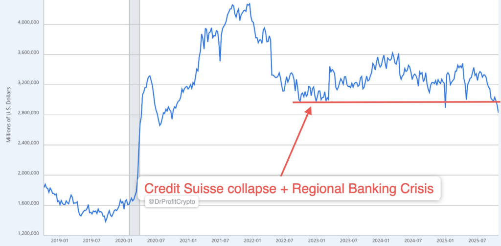 - This drop matters because bank reserves — essentially the cash banks park at the Federal Reserve — serve as a crucial safety net for the entire system. When they get too low, even small funding hiccups can snowball into bigger problems, just like we saw when multiple mid-sized banks failed in quick succession two years ago. Doctor Profit warns that “banking stress is close,” with liquidity getting tighter again.