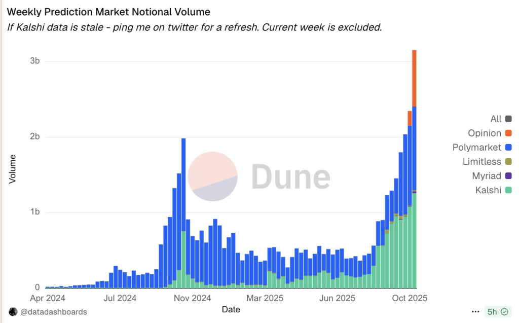 - Combined weekly volumes across Polymarket, Kalshi, Opinion, Limitless, and Myriad have now topped $3 billion, marking an acceleration unlike anything seen earlier in 2025. This spike reflects genuine user demand for platforms where people can put money behind their forecasts, creating what many see as more accurate signals than traditional polling.