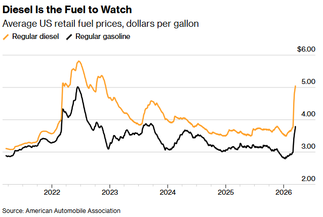 According to data from the American Automobile Association, diesel prices have surged from approximately $3.50 to more than $5.00 per gallon in early 2026. During the same period, gasoline prices remained mostly between $3.00 and $4.00 per gallon.