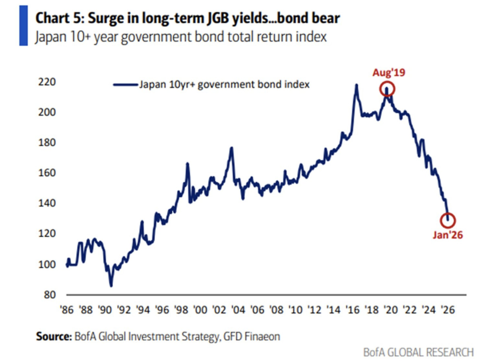 Japan’s long-term government bonds have suffered one of the sharpest downturns in modern financial history. Total returns on Japanese government bonds (JGBs) with maturities of 10 years and longer have fallen by roughly 40% from their 2019 peak, according to data from Bank of America Global Investment Strategy and GFD Finaeon.