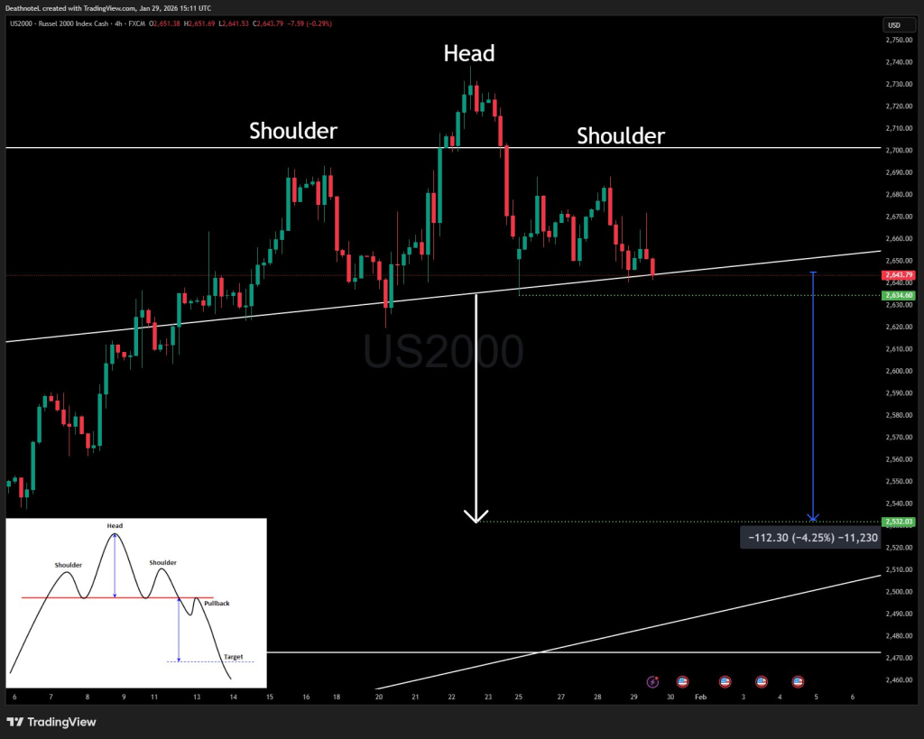 With the neckline now positioned near the 2,634 level, the Russell 2000 is approaching a critical inflection point. A decisive break below this support would confirm the bearish formation and open the door to a potential move toward the 2,530 area, while a successful defense of the level could invalidate the setup and signal further consolidation instead.