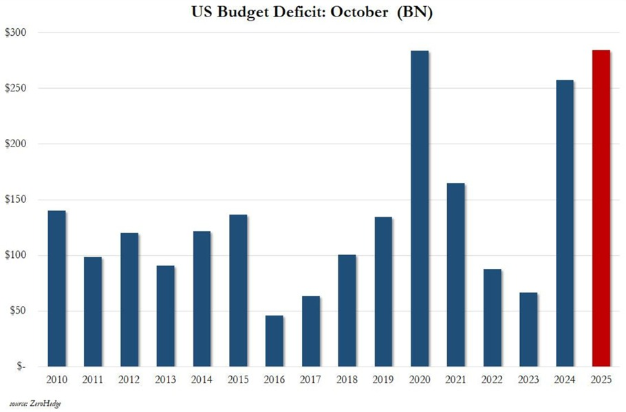 - Looking at the broader picture, October deficits stayed relatively tame through most of the 2010s before the sharp expansion that kicked off in 2020. The latest number is a world apart from the lower baseline we saw in earlier periods. “The U.S. government spent around $22.5 billion per day in October alone,” highlighting just how dramatically federal outlays have accelerated. With last year’s October deficit already pushing toward $250 billion, this year’s jump shows how quickly fiscal pressures are mounting.