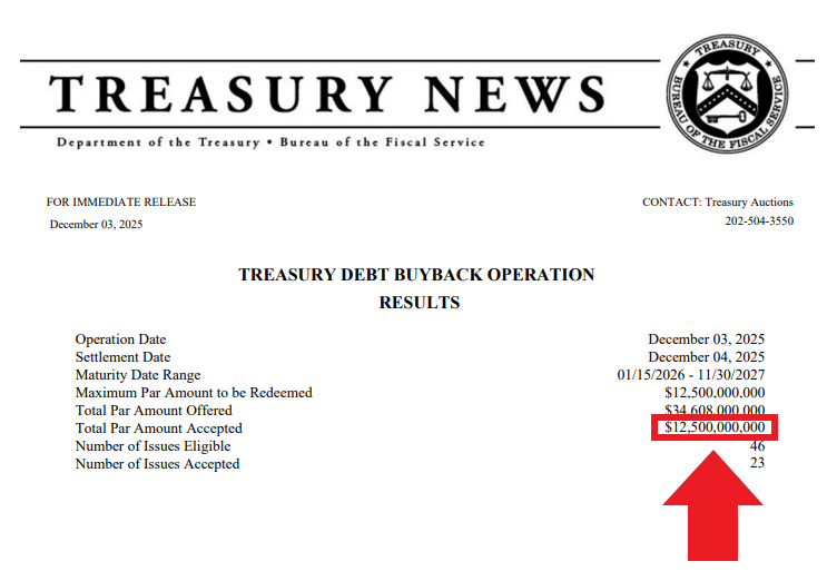- The U.S. Treasury just made history with its largest-ever debt repurchase, buying back $12.5 billion in outstanding securities on December 3. The operation focused on notes maturing between January 2026 and November 2027, part of a renewed push to manage market liquidity and smooth out the federal debt repayment schedule.