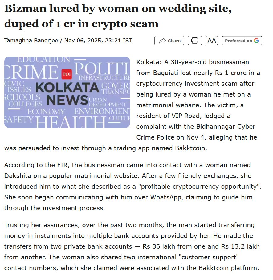 - A 30-year-old Kolkata businessman just lost nearly ₹1 crore to a crypto scam that started on a matrimonial site. Crypto India reported that the victim, who lives on VIP Road in Baguiati, filed a complaint with Bidhannagar Cyber Crime Police after being conned through a fake trading app called Bakkttcoin.