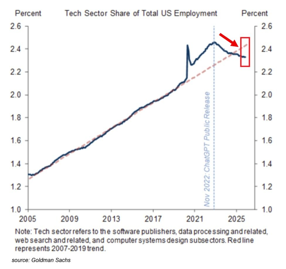 U.S. technology employment has declined to just 2.3% of total jobs in 2025, marking its lowest share since early 2021, according to industry labor data compiled by The Kobeissi Letter.