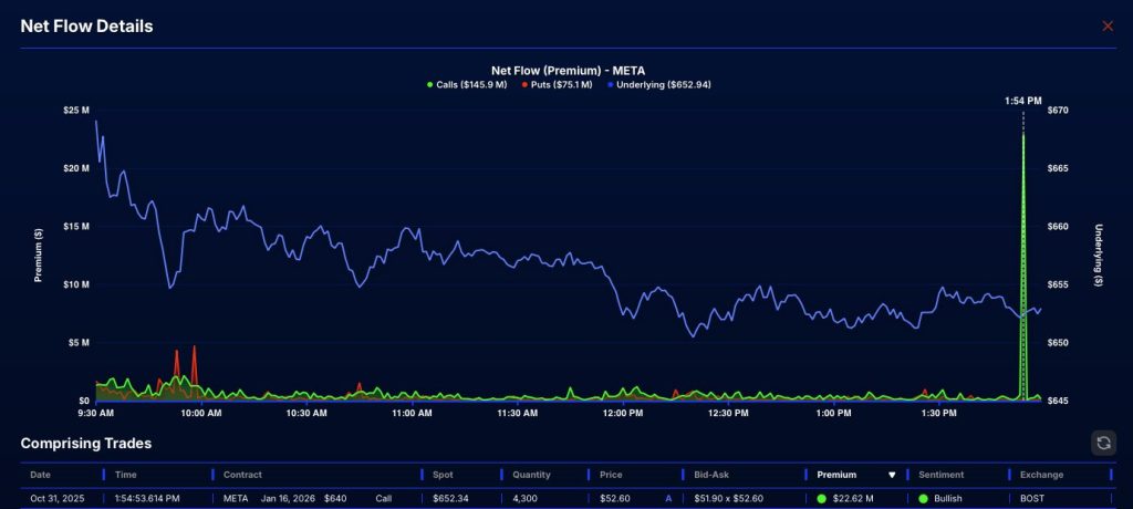 Despite recent tech sector pullbacks, Meta’s fundamentals are still solid. The company dominates AI-driven advertising and keeps growing revenue across Reels, WhatsApp, and ad tools. Long-dated calls like this usually reflect confidence in the bigger story—not just a quick flip. Institutional players might be using this pullback as an entry point ahead of AI updates and potential Q4 earnings catalysts.