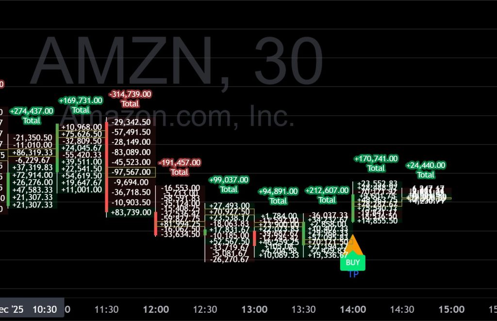 Amazon (AMZN) caught serious attention as order-flow data showed unusually heavy buying pressure during the latest session. Large buyers appear positioned inside the current price range, suggesting institutional players are actively engaging at these levels. The TradingView chart reveals dense clusters of positive orders, pointing to sustained demand rather than random trades.