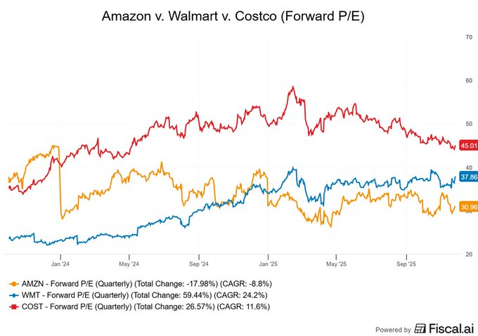 - A fresh valuation analysis reveals a striking disconnect between Amazon, Walmart, and Costco. While debate continues over whether Amazon is overvalued given its massive logistics network, booming ad business, and cloud dominance, the numbers tell a different story. Amazon’s forward P/E has been sliding downward, while Walmart and Costco have climbed significantly higher.