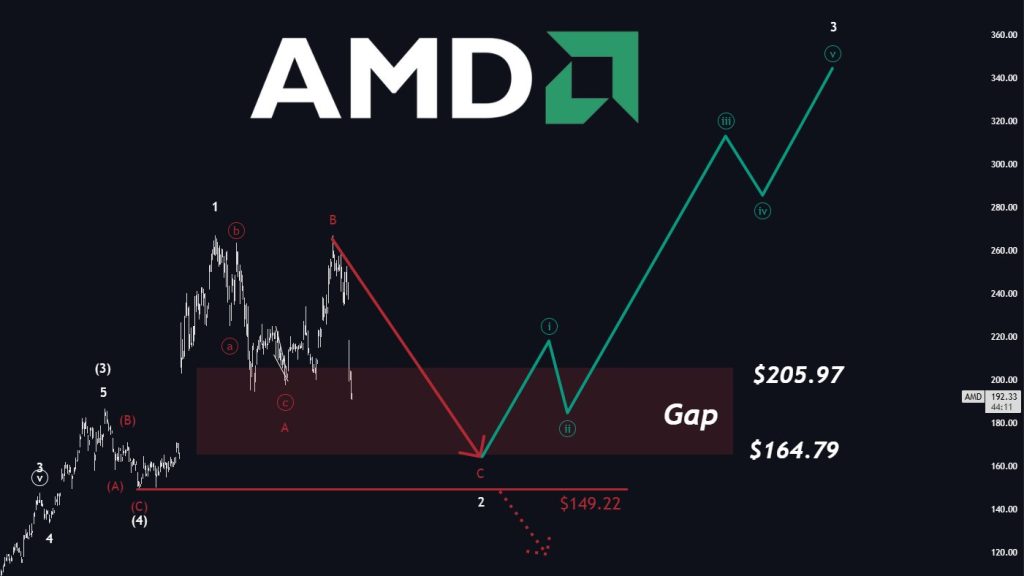 AMD is approaching a critical technical zone following sustained selling pressure. Current price action suggests the stock may continue lower into a large unfilled gap spanning roughly from $205.97 down to $164.79. This area is emerging as a key checkpoint in the broader corrective structure rather than a brief pullback.