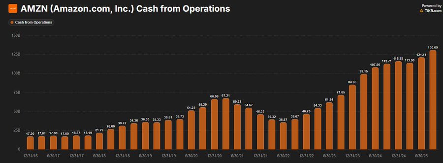Amazon posted another round of impressive operating cash flow gains, extending a trend that started in early 2023. The company’s operating cash flow climbed from $39.32 billion in Q1 2023 to $130.69 billion in Q3 2025. The data shows a clear upward trajectory, reflecting consistent improvements in operating efficiency and cash generation.