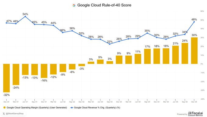 Shares of Alphabet Inc. (GOOGL) are drawing attention after its Google Cloud division posted a Rule-of-40 score of 78. The milestone highlights the company’s ability to balance accelerating revenue growth with improving profitability. As noted by market commentator Shay Boloor, “$GOOGL CLOUD HAS A RULE-OF-40 SCORE OF 78,” underscoring how rare it is to see both metrics expand simultaneously at scale.