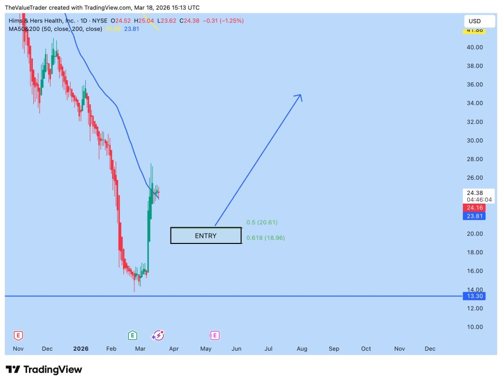 At the moment, HIMS appears to be at an important technical crossroads. The rebound from $13 support is encouraging, but without a controlled pullback and the formation of higher lows near Fibonacci support levels, the recovery thesis remains unconfirmed.