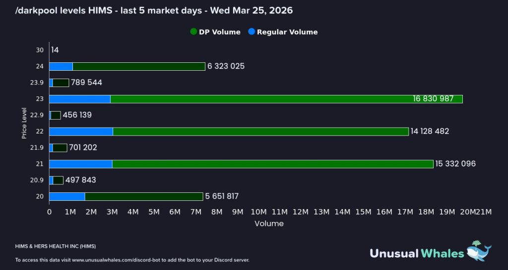 Recent dark pool data from Unusual Whales shows approximately 77 million shares were accumulated between $21 and $22 in a single trading session following the stock’s 41% gap higher on March 9. The rally followed news of the Novo Nordisk partnership, which removed a major uncertainty and triggered a strong bullish reaction. Similar institutional reactions to structural catalysts were also seen in HIMS stock technical structure analysis