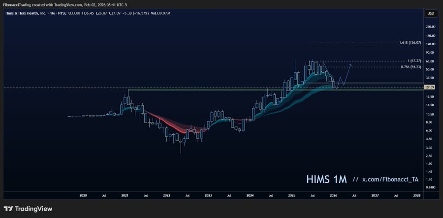 The outlook for HIMS depends almost entirely on whether price can continue to hold above monthly support. A breakdown would invalidate the bullish thesis quickly, while a renewed uptrend could open the path toward significantly higher levels over time. Until confirmation occurs, HIMS remains a high-risk, high-reward technical setup worth close monitoring.