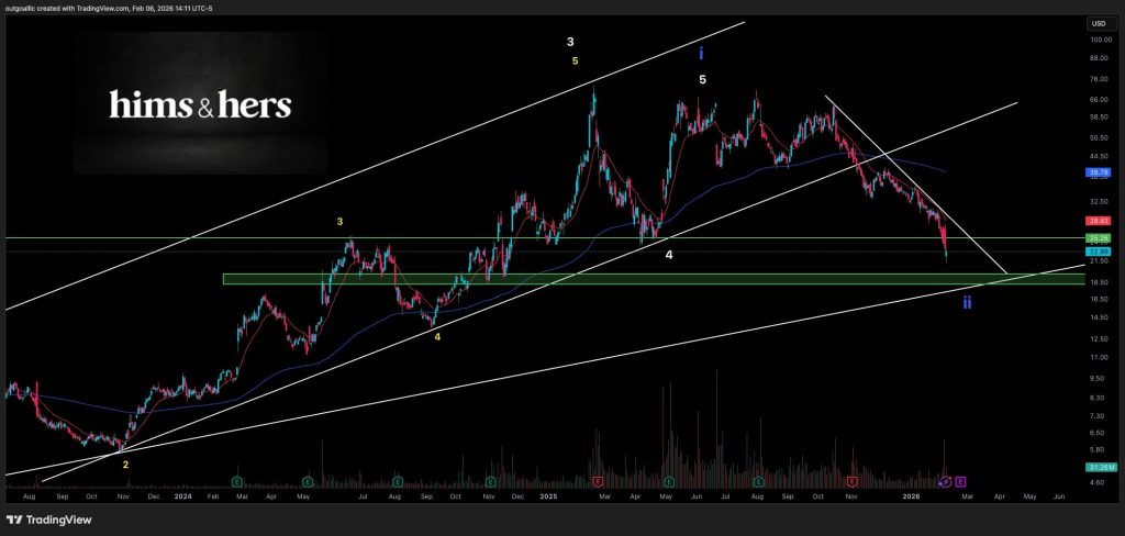 The recent rebound attempt lacked follow-through, reinforcing the broader downtrend that has been in place since HIMS broke below its prior rising channel. Price remains well below earlier highs, and the overall structure continues to reflect sustained selling pressure rather than a confirmed reversal.