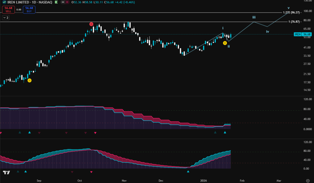 From a structural standpoint, IREN has formed a series of higher lows following a multi-week consolidation phase. At the same time, momentum oscillators are recovering from deeply compressed levels, a combination that often signals the early stages of trend expansion rather than a late-cycle move.