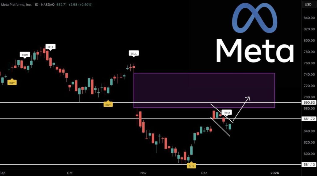 - Technically, the price action appears consistent with a flag-like structure, where META stock trades sideways after a prior advance. This pattern often reflects a pause in momentum as buyers and sellers rebalance positions. On the chart, Meta Platforms shares are holding above the $660 area, while resistance is visible closer to the upper zone around $690–$700. This range aligns with the stated near-term target of $700.