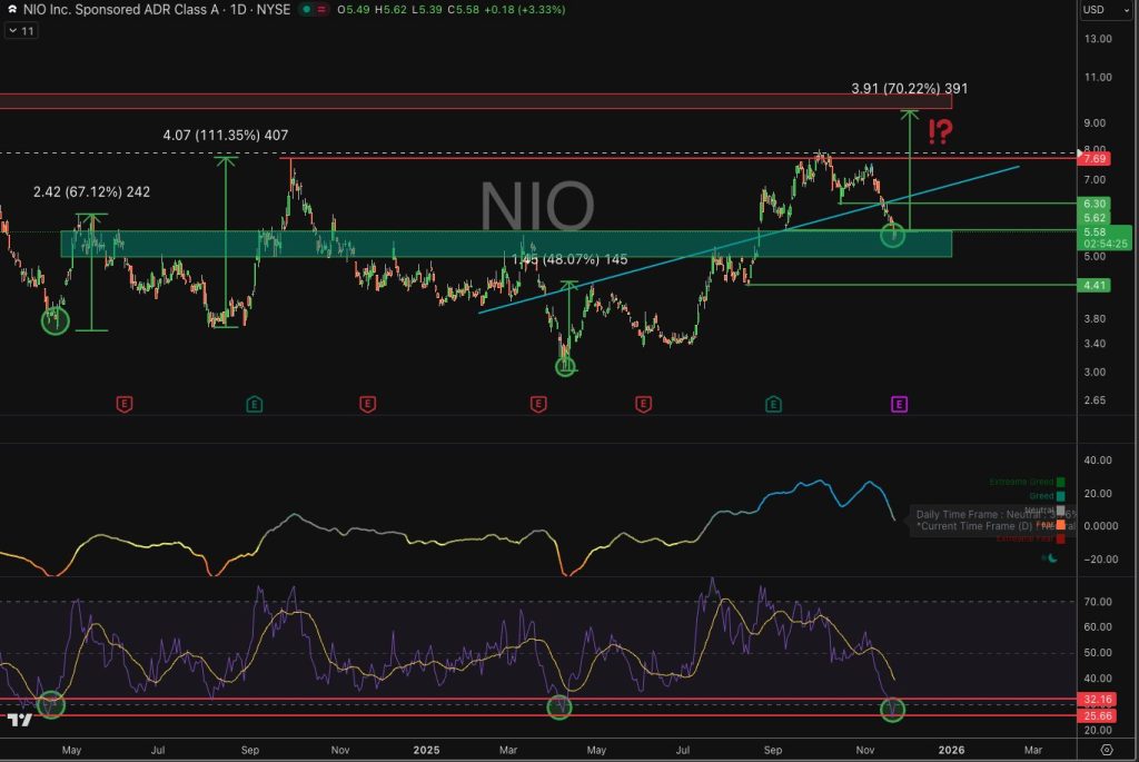 Every previous entry into this oversold territory resulted in sharp recoveries, typically ranging between 50% and 110%. The chart shows these earlier reversals across multiple years, with strong upside moves following technical exhaustion phases. Notably, those rebounds happened when NIO had weaker fundamentals and was far from profitability. With the stock trading near $5.50 and sentiment showing deep pessimism, the current structure mirrors prior bottoming patterns.