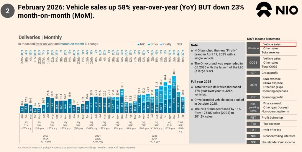 NIO reported 20,800 vehicle deliveries in February 2026, representing a 58% increase compared to the same month last year. While the headline figure signals continued expansion in China’s competitive EV market, a closer look at the data reveals widening performance gaps across the company’s brand portfolio.
