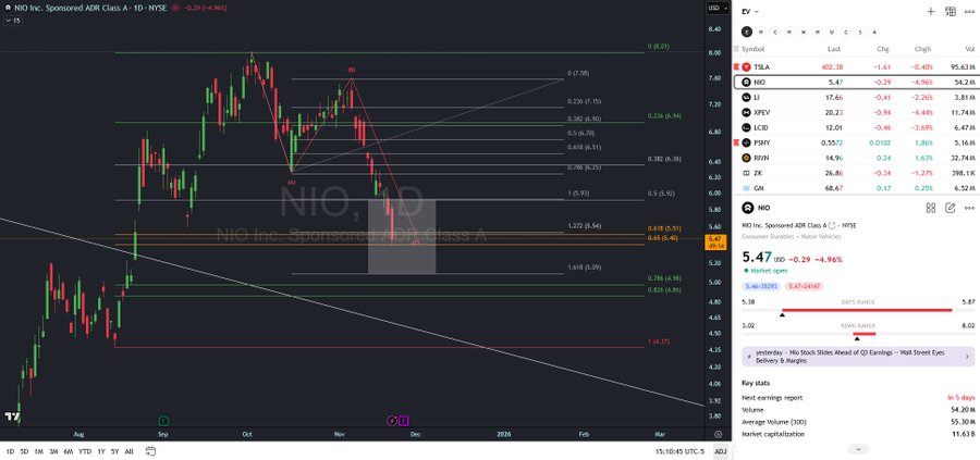 The chart shows NIO’s prolonged slide from early-November highs, following a clear pattern of lower highs and lower lows. Fibonacci levels between roughly $5.20 and $4.80 now form the primary support cluster. NIO is trading inside this zone, suggesting bearish momentum may be nearing exhaustion. Shares recently traded near $5.47, down nearly 5% on the day, while other EV names including TSLA, XPEV, and LI also finished in the red. The visible downtrend channel reinforces ongoing pressure, with no confirmed reversal signal yet.
