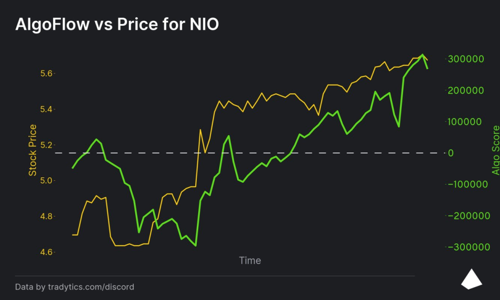 NIO stock has shown renewed strength after algorithmic flow indicators pointed to growing institutional accumulation. According to chart data, the stock advanced from approximately $4.60 to about $5.70, while algo flow readings crossed into positive territory and continued rising. Institutional buying activity appeared before the price rally, suggesting that large market participants began positioning early.