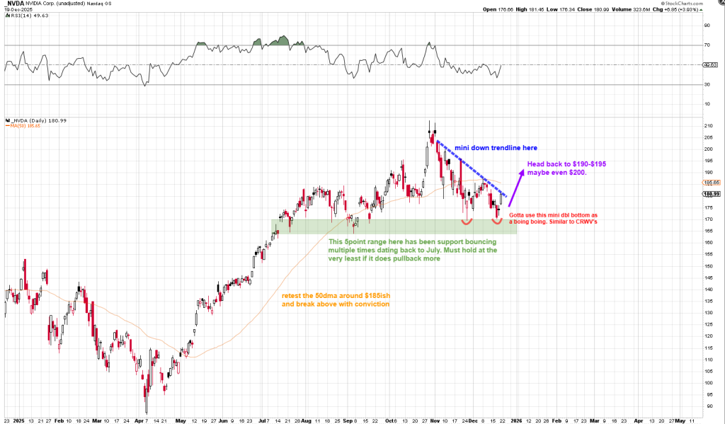 My Take: The setup looks textbook—solid support, descending resistance, and price coiling. If NVDA reclaims $185, we could see a quick move to $190-195. But without broader market support, it might just chop sideways into year-end.