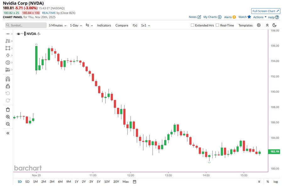 The trading pattern reflects heightened volatility around Nvidia, with the stock repeatedly testing short-term levels without securing a rebound. Throughout the afternoon, NVDA attempted to consolidate around the $182–184 range, but the broader intraday structure remained decisively negative.