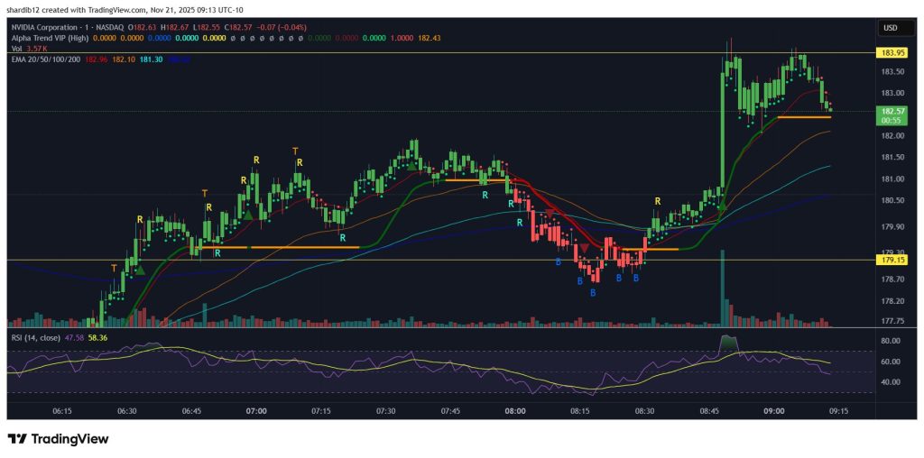 The authorization applies only to legacy products, leaving Nvidia unable to ship its most advanced AI accelerators to Chinese buyers. NVDA pulled back from its session high near $183.95 before settling around $182.50, reflecting cautious intraday sentiment. Trading showed a sharp spike followed by consolidation, with price moving closely around the 20-, 50-, 100-, and 200-period EMAs.