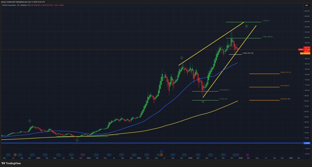 The chart shows NVDA trading below the upper boundary of a rising channel after several years of strong gains. Shares have pulled back from higher levels and now hover near intermediate Fibonacci retracement zones, including the 0.382 level around the mid-$160s. While this pullback hasn’t broken the broader uptrend yet, it reflects slowing momentum as the stock digests previous gains instead of extending higher.