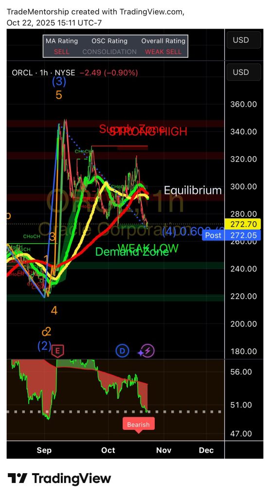 - According to Xtrades Analysts Team, “if you follow Elliott Waves, then $ORCL is very close to the bottom on Wave 4 retracement.” Their TradingView chart shows Oracle hovering around $272—right inside a key demand zone. The stock currently carries a Weak Sell rating, but the correction may be running out of steam. If buyers step in here, we could see a Wave 5 push higher. The $260–$270 zone has acted as solid ground before, where the stock found its footing and bounced.