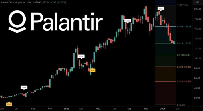 Palantir Technologies (PLTR) stock has retraced into a major technical support zone following a powerful rally that previously pushed shares above $200. According to Thomas James Investing, the stock is now testing the 0.618 Fibonacci retracement level measured from its all time highs to its all time lows. This level, often referred to as the golden pocket, is widely viewed by traders as a critical area within broader uptrends.