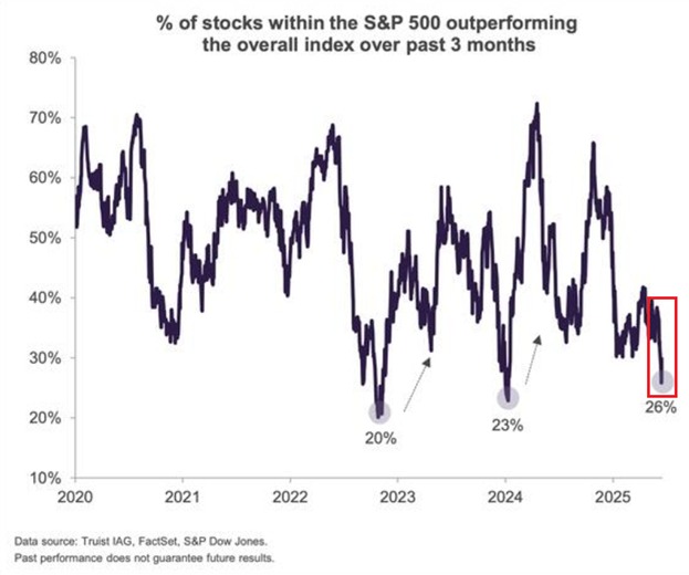 - This narrow leadership is a red flag. When fewer than one-third of stocks outperform the benchmark, volatility usually picks up and the market becomes fragile—vulnerable to earnings misses or shifts in sentiment. History shows this kind of breadth weakness often precedes pullbacks.