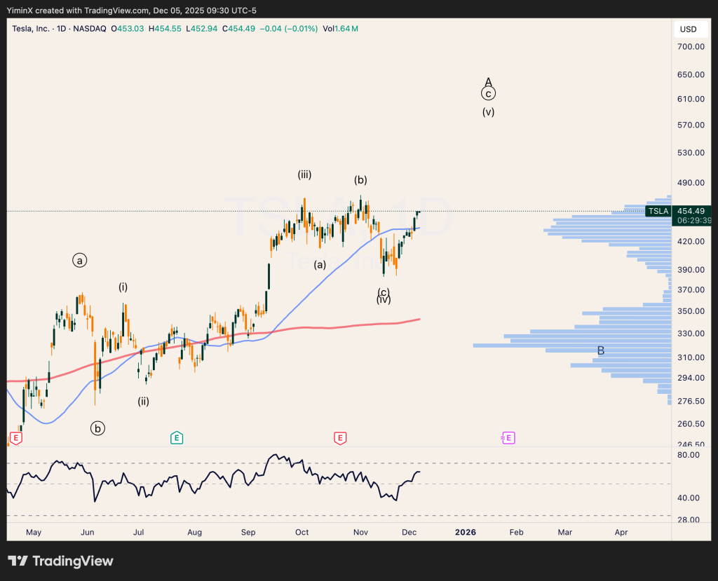 ● Tesla shares are picking up speed faster than many expected, building on the momentum that started from November’s swing low. The early wave is developing with impressive strength, and that steeper climb typically points to higher price targets down the road. Right now, TSLA is trading near 454 dollars while staying comfortably above its major moving averages, showing that buyers are still in control as this recovery phase unfolds.