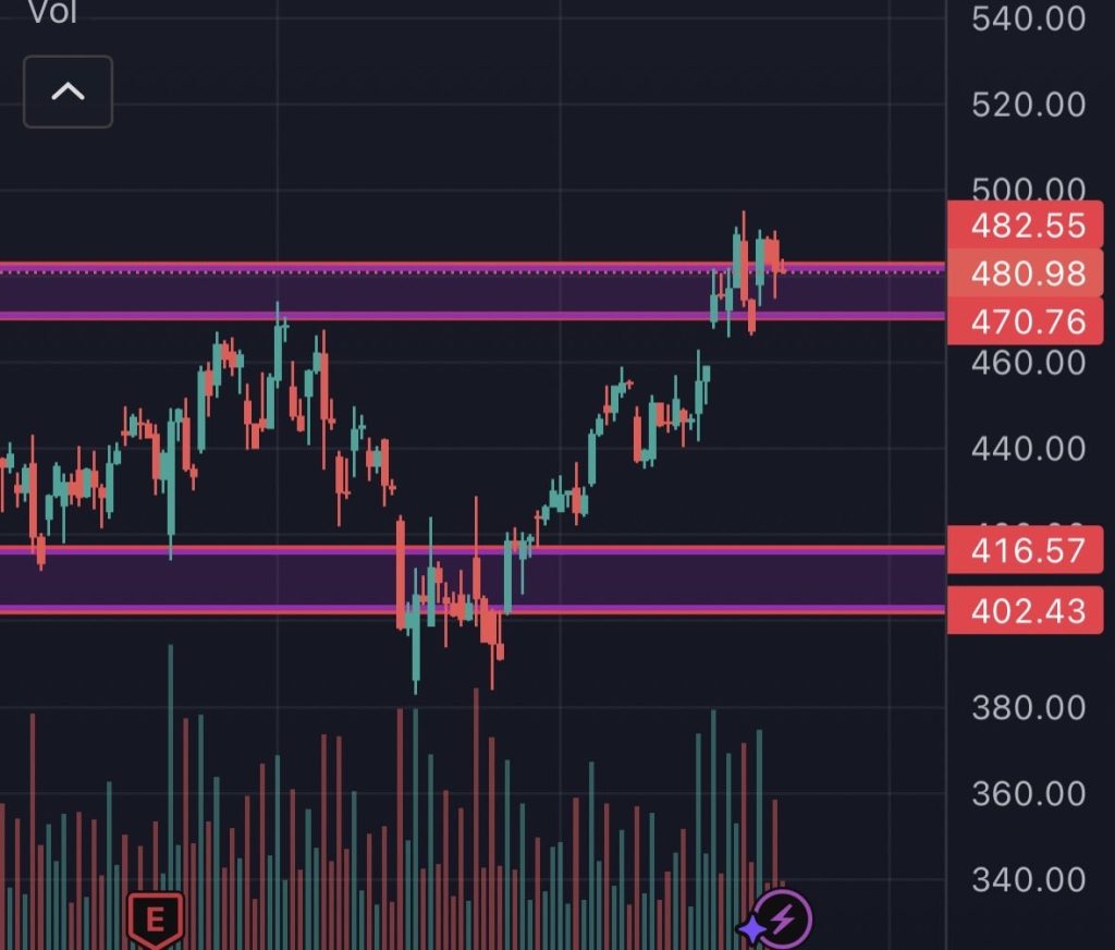 The chart tells a pretty straightforward story. Price bounced cleanly from around 402–416, then worked its way up toward that 480–485 resistance area. What stands out is how tight the consolidation is – we’re not seeing aggressive rejection candles, which is actually a good sign if you’re looking for upside.