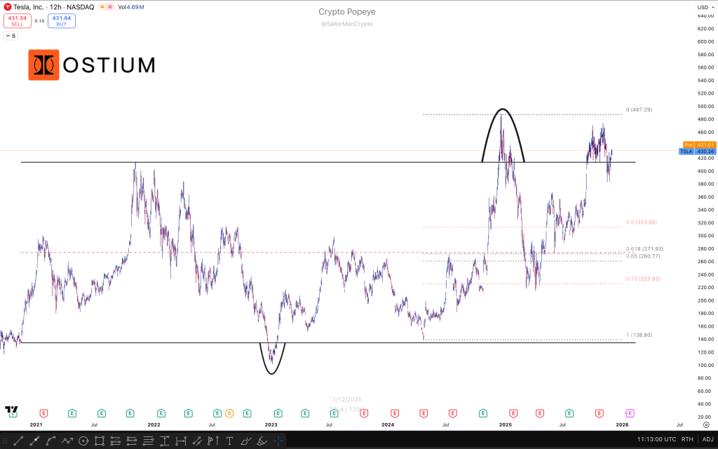 - Tesla has climbed back above its long-term macro range, rebuilding bullish structure on both 12-hour and 4-hour timeframes. The stock dipped below range support before mounting a sharp recovery, now trading above the critical 420–430 zone that marks the macro boundary.